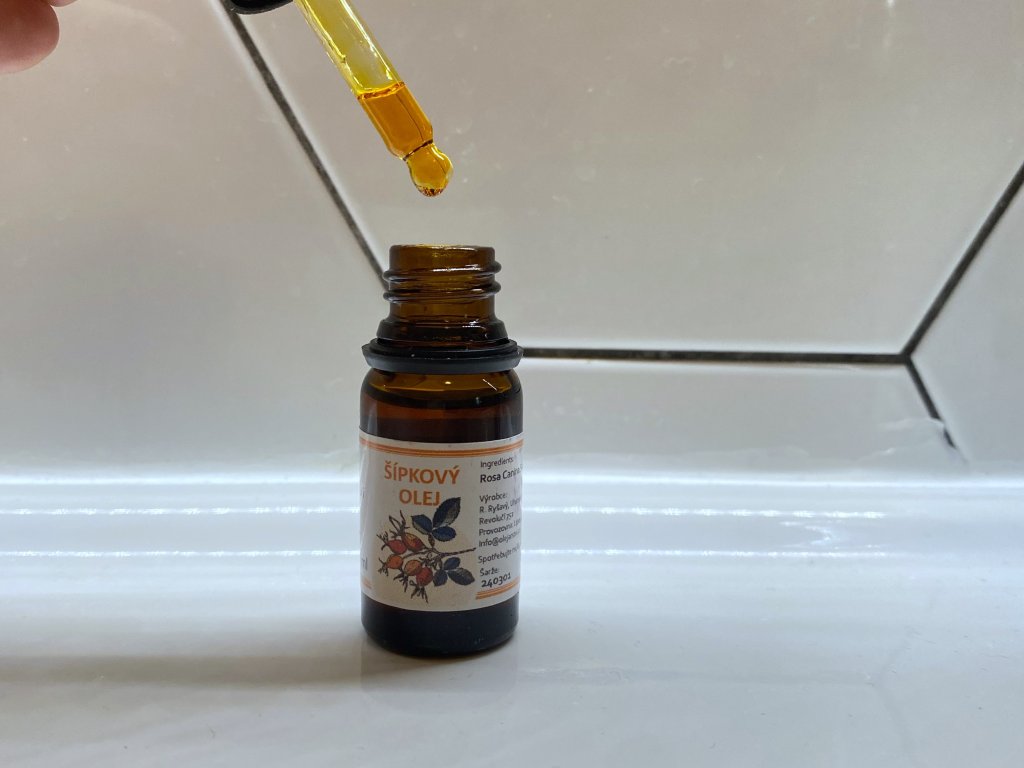 Na vlhkou pokožku rozetřete kapku šípkového oleje. Oranžové zabarvení rychle zmizí a olej se vsákne a vyživí pokožku. Nezůstává mastný film.